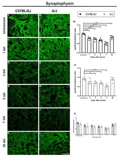 In A/J mice, despite showing a trend toward a gradual decrease in synaptic reactivity from the first day after lesion, it reached statistical significance at 3 dal, with a decrease of 23% (unlesioned vs. 3 dal, * p < 0.05), and remained so until 5 dal (unlesioned vs. 5 dal, * p < 0.05). The minimum integrated density of pixels was observed at 7 dal, with a decrease of 40% (unlesioned vs. 7 dal, *** p < 0.001). However, at 28 dal, no significant difference in comparison to the unlesioned counterpart was observed, in contrast to the C57BL/6J results.