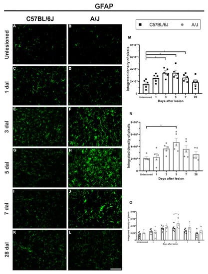 In A/J mice, GFAP upregulation became significant at 5 dal, being 121% higher than the control group (unlesioned vs. 5 dal, * p < 0.05). At 7 dal, the astroglial reaction began to return to basal levels, different from the C57BL/6J animals that still showed higher reactivity, 65% greater than the control (unlesioned vs. 7 dal, * p < 0.05). At 28 dal, both strains returned to basal levels of GFAP expression.