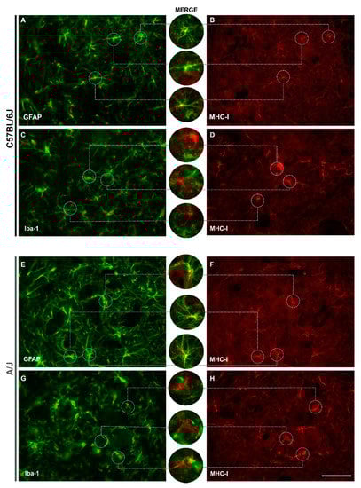 In C57BL/6J animals, when the markings are superimposed, it can be observed that astrocytic cells colocalize with the expression of MHC-I, both in their body and in their extensions (Figure 7A,B), unlike microglial cells (Figure 7C,D). The same phenomenon can be identified in the A/J lineage (Figure 7E–H).