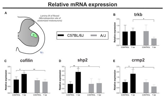 Motoneurons from the C57BL/6J and A/J strains were microdissected at 7 dal based on the data indicating the greatest synaptic retraction combined with glial reaction (Figure 8). The expression of genes related to the axonal cytoskeleton was analyzed, and interestingly, only C57BL/6J mice showed a significant increase when compared to control animals for genes such as crmp2 (unlesioned vs. 7 dal, * p < 0.05), cofilin (unlesioned vs. 7 dal, * p < 0.05), and shp2 (unlesioned vs. dal, ** p < 0.01). In contrast, trkb expression was not altered in either strain 7 days after lesion induction. Of note, the expression of all the genes studied was higher in animals of the C57BL/6J strain when compared to A/J (C57BL/6J vs. A/J—crmp2, ** p < 0.01; cofilin, ** p < 0.01; shp2, * p < 0.05, and trkb, * p < 0.05). All data are detailed in Table 3.