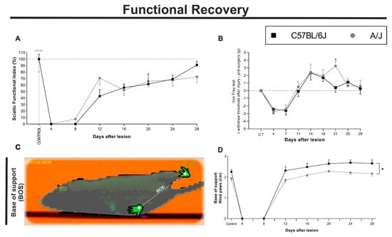 Proprioceptive recovery was performed through the base of support (BOS) evaluation, comparing C57BL/6J and A/J mice (Figure 9C). Data were obtained every 4 days from preoperative analysis and after sciatic nerve crush until 28 dal.