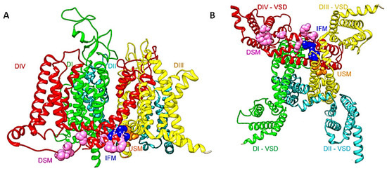 (A) A side view of the structure of the full length hNav1.5 (PDB ID code 6LQA) [9]. DI is shown in green, DII in cyan, DIII in yellow, and DIV in red. The DIII-DIV linker IFM motif is shown as navy-blue spheres. Upstream (USM) and downstream (DSM) mutations are shown as orange and pink spheres respectively. (B) A bottom view shows the inactivation gate and the missense mutations that target this area. The same color code is used as in (A).