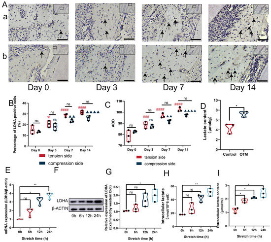 Mechanical force increased the expression of lactate dehydrogenase A (LDHA) and lactate production. (A–C) The expression of LDHA at the tension side (a) and the compression side (b) during OTM, as determined by immunohistochemistry (IHC). The black arrows indicated positive cells; scale bar = 50 μm. The expression of LDHA was determined by both the percentage of LDHA-positive cells (B) and the average optical density (AOD) (C) (### and #### represented p < 0.01 and p < 0.0001 in comparison with Day 0 on the tension side, respectively; ▲▲ and ▲▲▲▲ represented p < 0.01 and p < 0.0001 in comparison with Day 0 on the compression side, respectively; ns represented no significance between the tension side and the compression side). (D) The lactate content in the alveolar bone after being subjected to orthodontic force for 7 days. (E) The expression of LDHA at the mRNA level after being stretched for 0, 6, 12, and 24 h. (F,G) The expression of LDHA at the protein level after being stretched for 0, 6, 12, and 24 h. (H) Intracellular lactate concentration after being stretched for 0, 6, 12, and 24 h. (I) Extracellular lactate concentration after being stretched for 0, 6, 12, and 24 h. * p < 0.05. ** p < 0.01. ns = no significance.