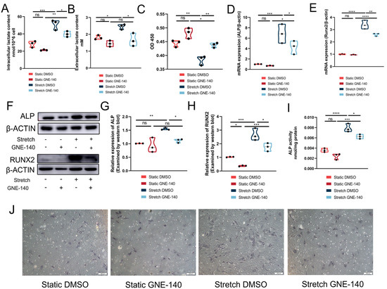 GNE-140 inhibited the osteogenic differentiation of ABMMCs under cyclic mechanical stretch. (A) Intracellular lactate concentration in GNE-140/DMSO-treated groups with or without cyclic mechanical stretch. (B) Extracellular lactate concentration in GNE-140/DMSO-treated groups with or without cyclic mechanical stretch. (C) Pyruvate level in GNE-140/DMSO-treated groups with or without cyclic mechanical stretch. (D,E) The expression of ALP and RUNX2 at the mRNA level in GNE-140/DMSO-treated groups with or without cyclic mechanical stretch. (F–H) The expression of ALP and RUNX2 at the protein level in GNE-140/DMSO-treated groups with or without cyclic mechanical stretch. (I) The ALP activity in GNE-140/DMSO-treated groups with or without cyclic mechanical stretch. (J) The ALP staining in GNE-140/DMSO-treated groups with or without cyclic mechanical stretch; scale bar = 200 μm. * p < 0.05. ** p < 0.01. *** p < 0.001. **** p < 0.0001. ns = no significance.