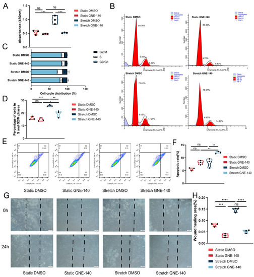GNE-140 suppressed the proliferation and migration, yet promoted apoptosis, of ABMMCs under cyclic mechanical stretch. (A) The proliferation of ABMMCs determined by the CCK-8 test in GNE-140/DMSO-treated groups with or without cyclic mechanical stretch. (B–D) The cell cycle distribution (B), the percentage of cell cycle distribution (C), and the percentage of S and G2/M phases (D) in ABMMCs in GNE-140/DMSO-treated groups with or without cyclic mechanical stretch. (E,F) The Annexin V-FITC/PI double staining in ABMMCs in GNE-140/DMSO-treated groups with or without cyclic mechanical stretch. (G,H) Representative images (G) and the wound healing area (H) of the scratch assay in ABMMCs in GNE-140/DMSO-treated groups with or without cyclic mechanical stretch; scale bar = 200μm. * p < 0.05. ** p < 0.01. *** p < 0.001. **** p < 0.0001. ns = no significance.