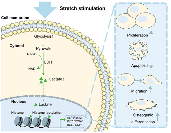 Stretch-stimulated lactate promoted the expression of ALP, Runx2, Ki67, CCNA1, BCL2, and SDF1 in ABMMCs through histone lactylation. Under stretch stimulation, the production of lactate could be elevated in ABMMCs. The stretch-induced lactate further promoted the proliferation, migration, and osteogenic differentiation of ABMMCs through histone lactylation of related genes. ABMMCs: alveolar bone marrow mesenchymal cells; NADH: nicotinamide adenine dinucleotide; LDH: lactate dehydrogenase.
