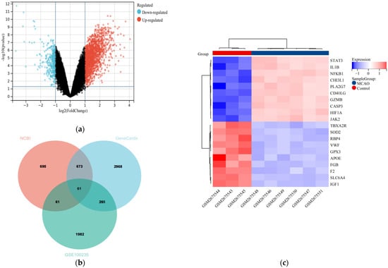 Gene expression data GSE100235 was downloaded from GEO, 19,634 genes were identified, and the differences between model and control groups in the dataset were analyzed using the limma package in R. We identified 1982 DEGs, including 1613 upregulated and 369 downregulated (Figure 1a). In addition, a total of 695 human IS-related genes were obtained on the NCBI platform, and 3000 stroke genes with a score > 1 were selected in the GengCards database. Finally, the genes obtained from both platforms were intersected with the DEGs to obtain 61 IS-DEGs (Figure 1b,c).