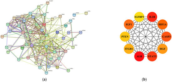 PPI network analysis of the IS-DEGs identified. (a) PPI network of all the IS-DEGs (interaction score >0.4). (b) The interaction network of top 10 hub genes.
