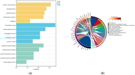 GO and KEGG pathway enrichment analyses of IS-DEGs. (a) The bubble plot showing the three aspects of enriched biological processes of biological process (BP), cell component (CC), and molecular function (MF), such as immune response and inflammatory response. (b) The chord plot showing the top 10 most enriched KEGG pathways of IS-DEGs. The screening criterion for significantly enriched biological processes and pathways was Q < 0.05. The Q value is the adjusted p value.