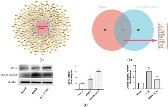 The HSYA-related chemical structural formulae were obtained from the TCMSP database, and 291 target genes (Figure 4a) for HSYA were obtained after gene ID transformation through the UniProt database. Combined with IS-DEGs, ten potential target genes of HSYA were obtained, specifically F2, CBS, IGF1, JAK2, PARP1, MIF, SOD2, CASP3, ALB, and FGG (Figure 4b). By combining the prediction results with literature reports, we selected HIF1A and CASP3 as target genes for exploring the mechanism of HSYA action in the treatment of experimental IS.