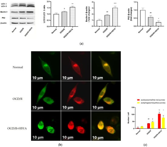 HSYA activates autophagy and maintains a stable autophagic flux in SH-SY5Y cells during the acute phase of OGD/R injury. (a) Western blotting for the levels of LC3, Beclin-1, and p62 in SH-SY5Y cells treated with indicated conditions. (b) Changes in autophagic flux of HSYA on OGD/R-treated SH-SY5Y cells. Fluorescence microscopy analysis of SH-SY5Y cells transfected with mCherry-GFP-LC3B; the image shown is one of the representative results for each group. (c) Statistical analysis of fluorescent dots in SH-SY5Y cells. Yellow dots indicate autophagosomes and red dots indicate autolysosomes in the merged images. Results are representative of three independent experiments, and the data were statistically analyzed using one-way ANOVA and expressed as mean ± standard deviation. (Note: compared with the normal group, ## p < 0.01, # p < 0.05; compared with the OGD/R group, *** p < 0.001,** p < 0.01, * p < 0.05.)