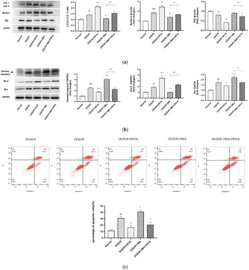 Next, different methods were used to verify autophagy’s effect on cell apoptosis. First, the autophagic activation after HSYA intervention was accompanied by the survival of SH-SY5Y cells by 3-(4,5-dimethylthiazol-2-yl)-2,5-diphenyltetrazolium bromide (MTT) and lactate dehydrogenase (LDH) assays (Supplementary Figure S2a,b). In addition, to verify whether HSYA-mediated autophagy participates in cell apoptosis during OGD/R injury, we used the autophagy inhibitor 3MA to evaluate autophagy changes (LC3II/LC3I ratio, Beclin-1 and P62 expression) and apoptosis-related indicators (Cleaved-Caspase-3 (Cl-Casp3), BAX, and Bcl-2). The results showed that the inhibition of autophagy increased the expression of Cl-Casp3 and BAX and decreased the expression of Bcl-2 (Figure 6a,b). Further, the flow cytometry results also showed that the inhibition of autophagy blocked the neuroprotective effect of HSYA (Figure 6c), suggesting that the neuroprotective effect of HSYA is related to the activation of autophagy during OGD/R.