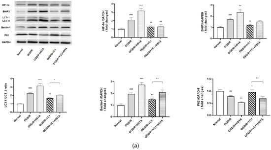 We used the OGD/R model to simulate in vitro ischemia/reperfusion (I/R)-like conditions. First, after discarding the complete medium and washing the cells with PBS, DMEM without glucose was added to the cells and placed in an anaerobic incubator (0.1% O2, 5% CO2, 94% N2, and 37 °C) for 6 h. After the OGD period, glucose was supplemented to normal levels. The cells were then placed in an incubator with normal growth conditions (37 °C containing 5% CO2 and 95% O2) and continued to incubate for 12 h. HSYA (25 μmol/L) and autophagy inhibitor 3-Methyladenine (3-MA) (5 mmol/L) were simultaneously administered. Hypoxia-inducible factor 1alpha (HIF-1α) inhibitor 3-(5′-Hydroxymethyl-2′-furyl)-1-benzylindazole (YC-1) was pretreated with 10 μM for 2 h prior to OGD.