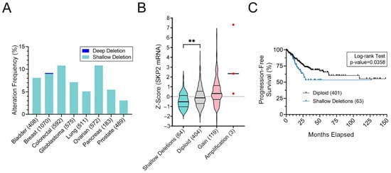 2.3. SKP2 Copy Number Alterations, Reduced Expression, and Survival Analyses