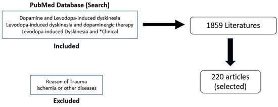 Parkinson’s disease (PD) is the second most common neurodegenerative disorder, characterized by progressive motor symptoms, including tremors, bradykinesia, rigidity, and impaired posture [1]. These motor symptoms result from the degeneration of the dopaminergic nigrostriatal pathway, which is the key function of the basal ganglia and responsible for bodily movements [2]. The most effective treatment for PD is l-3,4-dihydroxyphenylalanine (levodopa), which replenishes the dopamine levels in PD. Levodopa is very efficient during the first few years of administration, as in the earlier stages of PD, there are spared dopamine (DA) neurons that are able to store the exogenous dopamine and regulate its release and maintain normal physiological DA receptor stimulation within the striatum [3]. However, as PD progresses, the common motor symptoms of PD are reversed to levodopa-induced dyskinesia (LID), with the levodopa causing involuntary movements [4]. Around 80% of PD patients develop LID, with 30% developing it after just 3 years of levodopa treatments [5,6]. Dyskinesias can become treatment-limiting as increasing the levodopa dose as the disease progresses can exacerbate involuntary movements and decrease the quality of life of patients. As levodopa continues to be used as a treatment, LID becomes progressively worse until it becomes treatment-limiting, as increasing the levodopa dose with the disease progression can exacerbate involuntary movements and decrease the quality of life of patients. LID is rated on several different scales, including the Unified Parkinson’s Disease Rating Scale (UPDRS), the Rush Dyskinesia Scale (RDRS), the Abnormal Involuntary Movement Scale (AIMS), the Parkinson’s Disease Questionnaire-39 (PDQ-39), the Parkinson’s Disease Quality of Life Scale (PDQUALIF), and the Home Diary. The overall goal of the study is to look for the possible anticipated mechanisms involved in LID and the currently available therapeutics that are either studied preclinically or in clinical trials to alleviate the conditions in patients suffering from dyskinesia due to the levodopa medication. This idea of review accomplished with search of literature from PubMed using the keywords “dopamine AND levodopa-induced dyskinesia”, “levodopa-induced dyskinesia AND dopaminergic therapy”, and “levodopa-induced dyskinesia AND *clinical”. The reasons for trauma, ischemia, or other diseases were excluded. Out of the 1859 results, the most relevant 220 were selected for the review (Figure 1).