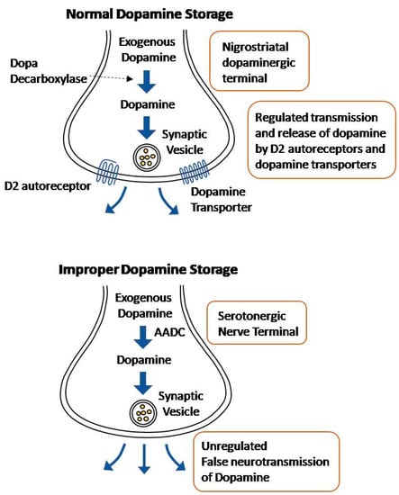 Normally, levodopa is decarboxylated to dopamine in the nigrostriatal dopaminergic terminals. The converted dopamine is transported to synaptic vesicles by dopamine transporters, where it is stored [39]. The release of this dopamine into the synaptic cleft is regulated by D2 autoreceptors and dopamine transporters [40]. However, exogenous levodopa may be metabolized in other terminals that express the enzyme aromatic L-amino acid decarboxylase (AADC), namely serotonergic and noradrenergic terminals [24].