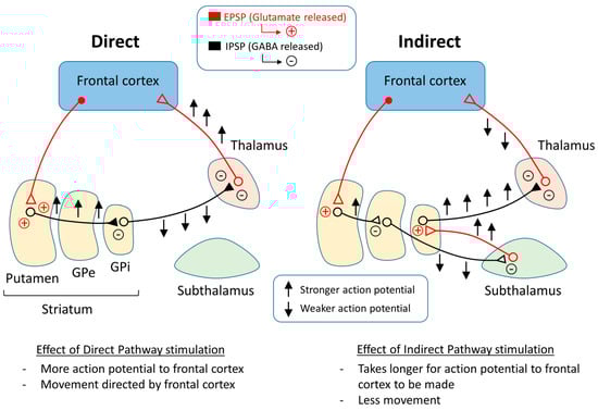 The direct pathway moves from the cortex down the cortical striatal pathway to the putamen and releases glutamate, stimulating an EPSP in the neurons of the putamen and sending a signal to the GPi by releasing GABA. From the GPi, the neurons stretch to the thalamus and release GABA, where action potentials are sent to the cortex as motor output. Thus, if the direct pathway is stimulated, there will be a stronger stimulus received by the frontal cortex, causing muscles to contract or move in some way.