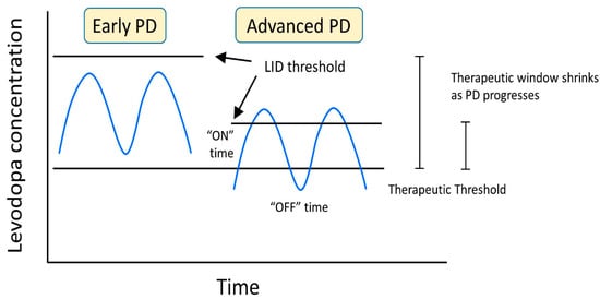When determining the best route of treatment for LID, several factors must be considered, including the time of dyskinesia, the type of dyskinesia, the current medication for PD, the duration of the disease, the stage of Parkinson’s, and the patient’s quality of life. The goal of managing LID is to maximize the patient’s quality of life by reducing the off time of the levodopa and maximizing the time by staying above the anti-parkinsonian threshold amount of the levodopa but under the LID threshold. Maintaining this window of levodopa and motor function can be accomplished by minimizing the fluctuations in the concentration of levodopa and dopaminergic stimulation in the basal ganglia (Figure 5).