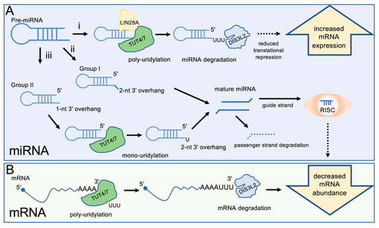 Although TUT4/7 and DIS3L2 are primarily recognized for their respective roles in mRNA uridylation and degradation, these enzymes are further associated with microRNA (miRNA) maturation, degradation, and stability. In miRNA metabolism, the role of uridylation by TUT4/7 in the cell is multifaceted, and several studies show that TUT4/7 can alter between processive oligouridylation and distributive monouridylation [16,17]. As with mRNA degradation, oligouridylation of pre-miRNAs by TUT4/7, in collaboration with the RNA-binding protein LIN28A, marks the miRNAs for degradation by the U-specific exonuclease DIS3L2 [16]. Whereas DIS3L2 degrades polyuridylated miRNAs [18,19,20], TUT4/7 are also capable of monouridylating miRNA substrates, which is generally associated with the stabilization of group II pre-miRNAs and increased mature miRNA levels [21]. During the maturation of group II miRNAs, TUT4/7 add a single uridine residue to the pre-miRNA substrate, a prerequisite to further processing by DICER [1,21]. These monouridylated miRNAs include the precursors of various let-7 family miRNAs [10,21,22], pre-miR-26a and mature miR-191 [16], and pre-miRNAs associated with AGO2 (argonaute RISC catalytic component (2)) during miRNA biogenesis [20,23]. Despite the contrasting outcomes of mono- and polyuridylation by TUT4/7, the knockdown of TUT4/7 leads to increased levels of mature group II miRNAs, along with decreased levels of their mRNA targets (Figure 1) [10,23].