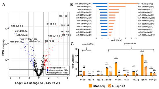 TUT4/7 regulate miRNAs by adding untemplated uridines to the 3′ end. Although the distinct roles of TUT4/7 have been well defined, it is unclear to what extent TUT4/7 regulate overall miRNA abundance. To investigate the regulation of miRNAs by these two enzymes, we performed miRNA sequencing of HEK 293T cells, comparing a TUT4/7 knockout strain [26] (ΔTUT4/7) to wild type cells (WT). We analysed miRNA expression using Partek gene-specific analysis (GSA). In total, we identified 115 miRNAs that increased in abundance by more than 2-fold in ΔTUT4/7 cells and 91 miRNAs that decreased by at least 2-fold (Figure 2A, Tables S2 and S3, Supplementary Files S1–S3). For 27 miRNA pairs, both the 5′ strand and the 3′ strand were detected. In general, both the 5p and 3p miRNAs from the same pre-miRNA increased or decreased similarly, for example, let-7i-5p levels increased by 31-fold in ΔTUT4/7 cells, while let-7i-3p increased by 33-fold (Figure 2A, Table S4). However, for the let-7 family miRNA, in particular, the 5p miRNAs are thought to act as the guide strand, while the 3p miRNA is degraded [34]. We, therefore, focused our further analysis on 5p miRNAs when both miRNA strands were detected, unless otherwise specified.