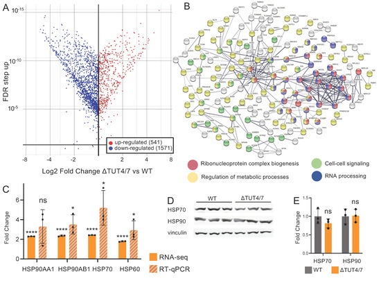 Messenger RNAs are differentially regulated in HEK 293T cells lacking TUT4/7. (A) Volcano plot of mRNA log2 expression fold change (FC) in ΔTUT4/7, relative to wild-type HEK 293T cells, versus false discovery rate (FDR). Significantly (FDR ≥ 1, log2FC ≥ 1 or ≤ −1) changed mRNAs are indicated in red (upregulated, 541 mRNAs) or blue (downregulated, 1573 miRNAs). The mRNAs not significantly changed in expression are depicted in black. (B) Search Tool for the Retrieval of Interacting Genes/Proteins (STRING) analysis reveals a physical subnetwork of mRNAs that are at least 2-fold upregulated in ΔTUT4/7 cells. GO analysis of the STRING network shows enrichment in the following: ribonucleoprotein complex biogenesis (red, strength 0.53), regulation of metabolic process (yellow, strength 0.12), cell–cell signaling (green, strength 0.27), and RNA processing (blue, strength 0.29). Differentially expressed mRNAs not included in these GO terms are indicated in white; those with no interactions to others are not included in the network. Confidence strength of data support was calculated by log10 (observed/expected) and is indicated by line thickness, with thicker lines indicating stronger supporting data. (C) RNA sequencing (orange) and RT-qPCR (orange and grey hashmarks) of mRNAs involved in heat shock response in ΔTUT4/7 cells. Fold change is calculated relative to wild-type HEK 293T cells. (D) Western blotting and (E) quantification of heat shock response protein levels in WT (grey) and ΔTUT4/7 (orange) HEK 293T cells. Significance was calculated by Partek gene specific analysis (GSA) (RNA-seq) or Student’s t-test (RT-qPCR, Western blot) where ns = not significant; * p < 0.05,**** p < 0.0001.