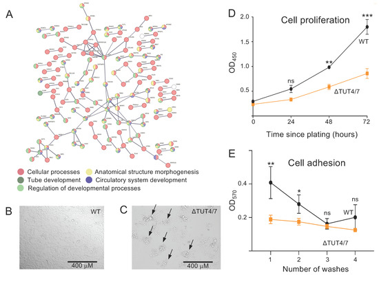 Messenger RNAs downregulated in ΔTUT4/7 cells are implicated in changes to cellular phenotype. (A) Search Tool for the Retrieval of Interacting Genes/Proteins (STRING) analysis reveals a physical subnetwork of mRNAs that are at least 2-fold downregulated in ΔTUT4/7 cells with a stringent false discovery rate to reduce nodes (FDR < 1−10). Gene Ontology (GO) analysis of the STRING network shows enrichment of cellular processes (red, strength 0.06), circulatory system development (blue, strength 0.42), regulation of developmental processes (light green, strength 0.26), anatomical structure morphogenesis (yellow, strength 0.28), and tube development (dark green, strength 0.41). Differentially expressed mRNAs not included in these GO terms are indicated in white; those with no interactions to others are not included in the network. Confidence strength of data support is calculated by log10 (observed/expected) and indicated by line thickness, with thicker lines indicating stronger supporting data. (B,C) Representative images of (B) wild-type and (C) ΔTUT4/7 HEK 293T cells 72 h after plating at 5 × 104 cells per mL show multicellular aggregates in ΔTUT4/7 cells (black arrows). (D) CCK-8 cell proliferation assay of wild-type (black circles) versus ΔTUT4/7 (orange squares) HEK 293T cells. (E) Quantification of a crystal violet cell adhesion assay of wild-type (black circles) versus ΔTUT4/7 (orange squares) HEK 293T cells. Significance was calculated by 2-way ANOVA in GraphPad Prism and is indicated by asterisks, where ns = not significant; * p < 0.05; ** p < 0.01; *** p < 0.001.