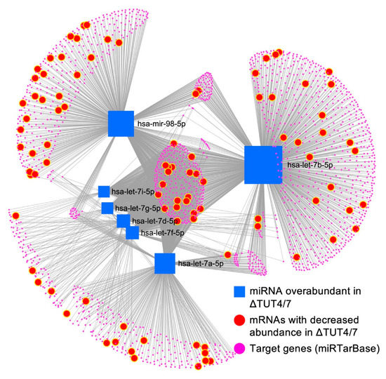 TUT4/7 deleted cells are revealed to have a 3-fold larger amount of downregulated genes, compared to upregulated genes, indicating extensive secondary gene regulation in the deletion strain. Reduced gene expression levels can be caused by decreased expression or increased degradation. Whereas RNA sequencing cannot discern between these two events, miRNAs are well known to regulate mRNA stability and abundance [52]. To investigate whether mRNAs that are known targets of the upregulated miRNA let-7 family are downregulated, we constructed an miRNA–mRNA network using miRTarBase [31], where the connections between the upregulated group II let-7 miRNA family members let-7a, let-7b, let-7d, let-7f, let7-g, let-7i, and miR-98 and their predicted target mRNAs from miRTarBase are probed for miRNA–mRNA interaction. The miRNA–mRNA network shows that 94 of the 1933 potential let-7 family miRNA targets are downregulated in the TUT4/7 deletion strain (Figure 5, Table S10, Supplementary Files S12–S14). These data indicate that although the let-7 miRNAs are significantly more upregulated, only ~5% of their target mRNAs are downregulated. Whereas some mRNAs have binding sites for multiple let-7 miRNAs, miR-98 has the broadest substrate range, with 50 (28 unique) identified mRNA targets among the significantly downregulated mRNAs. Let-7b has 48 identified downregulated gene targets, including 23 unique targets, and let-7a has 32 downregulated targets, of which 11 are unique. On the other hand, let-7d, let-7f, let-7g, and let-7i share most of their targets; all 20 downregulated mRNA targets of let-7i are shared targets of the group II let-7 miRNAs.
