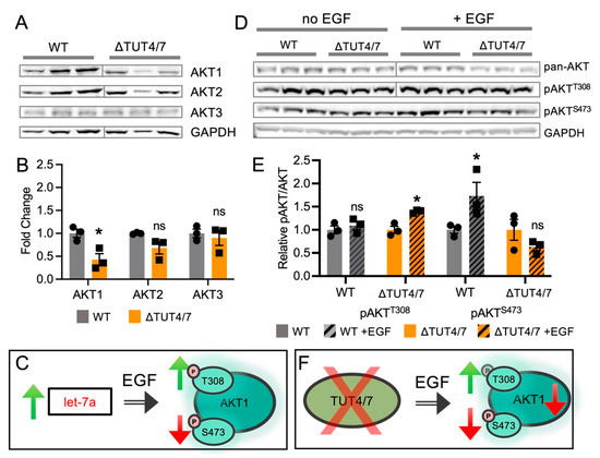 Messenger RNA and protein abundance are not directly related in the TUT4/7 deletion. (A) Western blots and (B) quantification of AKT isozymes in wild-type (black, circles) and ΔTUT4/7 (orange, squares) HEK 293T cells. (C) Artificial increase in let-7a levels by transfection was shown previously to increase T308 phosphorylation and reduce S473 phosphorylation of AKT1 in response to epidermal growth factor stimulation. (D) Western blots and (E) quantification of pan-AKT phosphorylation in wild-type (black, circles) and ΔTUT4/7 (orange, squares) HEK 293T cells. (F) Deletion of TUT4/7 alters response to EGF stimulation, increasing phosphorylation of AKT at T308 and reducing the response at S473. AKT1 specifically is decreased in ΔTUT4/7 cells. Blots were cropped to remove empty lanes (A) or molecular weight guides (D) for clarity. Asterisks indicate significance in Students t-test or ANOVA in GraphPad Prism where ns = not significant; * p < 0.05.