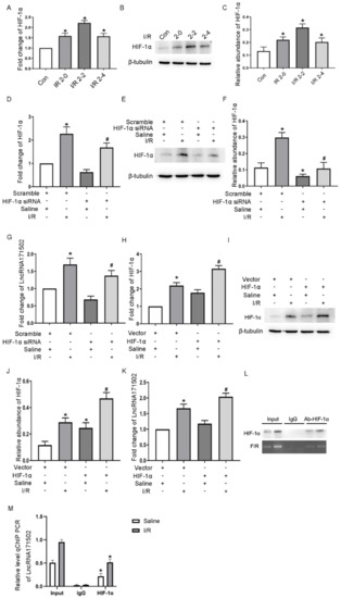 IRI-induced expression of HIF-1α regulates the expression of lncRNA171502 in BUMPT cells. The cells were given 1.5 μM calcium and 10 μM antimycin A (I, 2 h)/(R, 0, 2, and 4 h), transfected with HIF-1α siRNA/plasmid or scramble, and subsequently treated with/without I (2 h)/R (2 h) injury. (A) RT-qPCR was applied for the determination of the HIF-1α level. (B) Immunoblot assessment of HIF-1α expression. (C) Gray determination of HIF-1α and β-tubulin. (D) RT-qPCR for the detection of the HIF-1α level. (E) Immunoblot evaluation of HIF-1α expression. (F) Densitometric analysis of HIF-1α and β-tubulin. (G) RT-qPCR for the measurement of the lncRNA171502 level. (H) RT-qPCR for the assessment of HIF-1α expression. (I) Immunoblot assessment of the HIF-1α level. (J) Densitometric analysis of HIF-1α and β-tubulin. (K) RT-qPCR for the detection of the lncRNA171502 level. (L) Chip detection revealed a binding site (121 bp fragment) for HIF-1α in the promoter region of lncRNA171502. The two lanes mean control and IRI. Input means to detect the HIF-1α protein in the promoter region of lncRNA502 without ChIP; IgG refers to the negative control in the ChIP process to ensure the removal of false positives; Ab-HIF-1α means the detection of HIF-1α in the promoter region of lncRNA502 after ChIP. (M) ChIP analysis of HIF-1α binding to lncRNA171502 promoter. The immunoprecipitated samples were subjected to RT-qPCR analysis of lncRNA171502 promoter sequences. Mean ± SD (n = 6). * p < 0.05, IRI group vs. sham or control group. # p < 0.05, HIF-1α siRNA group with IRI or HIF-1α plasmid group with IRI vs. scramble group with IRI.