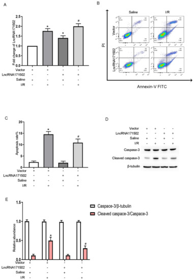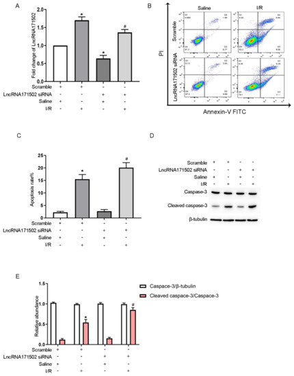 Overexpression of lncRNA171502 attenuates IRI-induced BUMPT cell apoptosis. BUMPT cells were exposed to cell transfection with lncRNA171502 plasmid or control, followed by exposure to I (2 h)/R (2 h) injury or not. (A) RT-qPCR was used to detect the lncRNA 171502 level. (B) FCM was applied to analyze BUMPT cell apoptosis. (C) Representative apoptotic rate (%) was assessed. (D) Immunoblotting was utilized to examine the levels of C3 and CC3. (E) Densitometric analysis of C3, CC3, and β-tubulin. Mean ± SD (n = 6). * p < 0.05, scramble or lncRNA 171502 plasmid group with IRI vs. scramble group; # p < 0.05, lncRNA171502 plasmid group with IRI vs. scramble group with IRI.