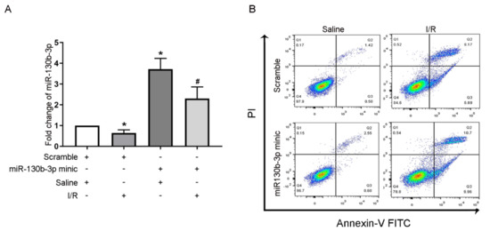 A recent study has demonstrated that miRNA-130b-3p can mediate IRI-induced cardiomyocyte apoptosis [31]. The RT-qPCR assays revealed that the miRNA-130b-3p mimics potentiated miRNA-130b-3p’s expression under the basal and IRI conditions (Figure 6A). The FCM and immunoblot analyses indicated that transfection with miRNA-130b-3p mimics promoted IRI-induced apoptosis and enhanced the expression of CC3 in BUMPT cells (Figure 6B–E). Taken together, these results showed that miRNA-130b-3p could also promote the apoptosis of renal cells during ischemic injury.