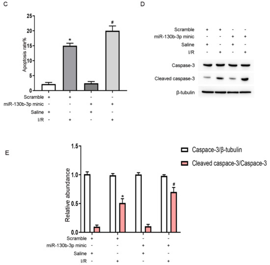Overexpression of miRNA-130b-3p elevates the levels of apoptosis-related proteins in BUMPT cells after IRI. The cells were transfected with 100 nM miRNA-130b-3p mimics or scramble before I (2 h)/R (2 h) injury. (A) The expression of miRNA-130b-3p was evaluated by RT-PCR, (B) BUMPT cell apoptosis was determined by FCM, (C) and representative apoptotic rate (%) was calculated. (D) The levels of apoptosis-related proteins were detected by immunoblotting. (E) Densitometric analysis of C3, CC3, and β-tubulin. Mean ± SD (n = 6). * p < 0.05, scramble group with IRI or mimic group with saline vs. scramble group; # p < 0.05, miRNA-130b-3p mimic group with IRI vs. scramble group with IRI.