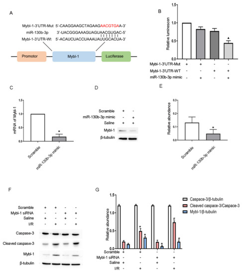 Mybl-1 is a direct target of miRNA-130b-3p. The cells were exposed to 100 nM miRNA-130b-3p mimic or 100 nM Mybl-1 siRNA or scramble before I (2 h)/R (2 h) injury. (A) The complementary sequences of miRNA-130b-3p and Mybl-1. (B) miRNA-130b-3p was co-transfected with the 3′UTR DLR vector of Mybl-1-WT or MUT, and then the luciferase activities were detected. (C) RT-qPCR determination of the mRNA level of Mybl-1. (D) Immunoblot assessment of the levels of Mybl-1 and β-tubulin. (E) Densitometric analysis of Mybl-1 and β-tubulin. (F) Immunoblot detection of C3, CC3, and Mybl-1 expression. (G) Densitometric analysis of C3, CC3, Mybl-1, and β-tubulin. Mean ± SD (n = 6). * p < 0.05, miRNA-130b-3p mimic group vs. scramble group or scramble group with IRI vs. scramble group with saline; # p < 0.05, Mybl-1 siRNA group with IRI vs. scramble group with IRI; ▲ p < 0.05, Mybl-1 WT/miRNA-130b-3p vs. other groups.