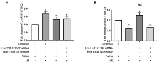 Long non-coding RNA (lncRNA) is an RNA transcript greater than 200 nucleotides in length. lncRNA plays vital roles in many physiological processes and acts as a competing endogenous RNA (ceRNA) to modulate microRNA (miRNA) activities [10,11]. MiRNA, especially 22 nt endogenous RNA, targets mRNA to regulate gene expression via the suppression of translational activity [12]. In recent years, many studies have demonstrated that lncRNA is associated with the progression of AKI. For example, lncRNAs MEG3, XIST, and ENSMUST_147219 mediated IAKI by facilitating the apoptosis of renal tubular cells [13,14,15]. By contrast, H19, lncRNA136131, and lncRNA NONRATG019935.2 mitigated IAKI via the suppression of renal tubular epithelial cell apoptosis [16,17,18]. LncRNA171502 is located at chr14:41307367-41307568. However, its function and regulatory mechanisms in IAKI remain unclear and require further investigation.