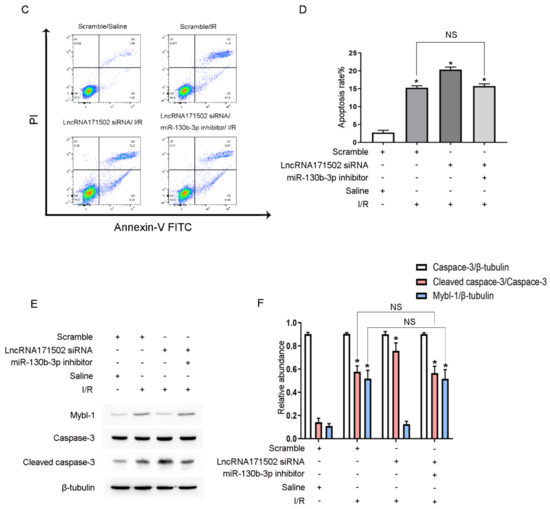 miRNA-130b-3p inhibitor reverses the proapoptotic effect of lncRNA171502 siRNA during ischemic injury. The cells were co-transfected with siRNA lncRNA171502 (100 nM) with/without anti-miRNA-130b-3p and then exposed to I (2 h)/R (2 h) injury. (A,B) The levels of lncRNA171502 and miRNA-130b-3p were measured by RT-qPCR. (C) BUMPT cell apoptosis was examined by FCM. (D) Representative apoptotic rate (%) was evaluated. (E) The levels of C3, CC3, and Mybl-1 were measured by immunoblotting. (F) Densitometric analysis of C3, CC3, Mybl-1, and β-tubulin. Mean ± SD (n = 6). * p < 0.05, scramble group with IRI vs. scramble group with saline; lncRNA171502 siRNA group with IRI vs. scramble group with IRI; # p < 0.05, lncRNA136131 siRNA + anti-miRNA-130b-3p group with IRI vs. scramble group with IRI. NS: no significance.