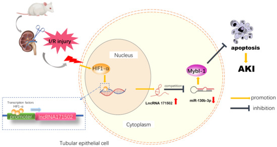 This study, for the first time, indicated that lncRNA171502 was an apoptosis suppressor induced by HIF-1α during ischemic injury. Mechanistically, lncRNA171502 sponged miRNA-130b-3p to upregulate the expression of Mybl-1. The overexpression of lncRNA171502 could attenuate IAKI by regulating the miRNA-130b-3p/Mybl-1 axis. Taken altogether, the lncRNA171502/miRNA-130b-3p/Mybl-1 axis prevented the progression of IAKI and might be a new therapeutic target for treating this disease.