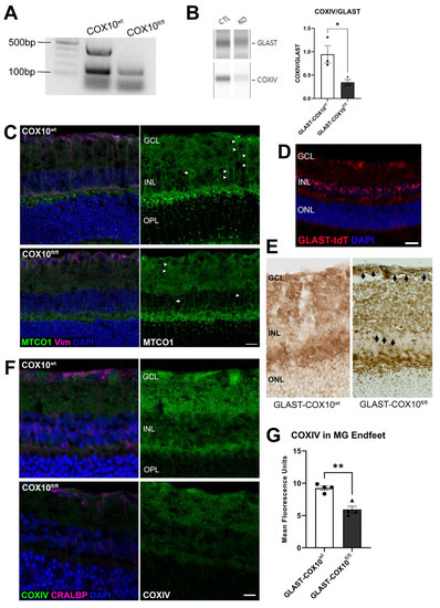 To investigate the importance of oxidative phosphorylation to MG function in vivo, we crossed mice homozygous for floxed Cox10 with mice hemizygous for GLAST-cre. Following tamoxifen treatment of GLAST-COX10fl/fl mice, we confirmed Cox10 gene recombination using PCR and genomic DNA from the retinas of 3-month-old mice. An approximately 500 bp band from the mutant retinas confirmed the loss of exon 6 from the Cox10 gene (Figure 1A). COX10 immunofluorescence indicated a significant loss of protein in the MG of the GLAST-COX10fl/fl mice (Supplementary Data, Figure S1). COX10 protein is required for the assembly of cytochrome c oxidase (Complex IV, or COXIV), so we analyzed COXIV protein levels using capillary electrophoresis and immunohistochemistry. These analyses revealed that compared to control mice, primary MG cells from GLAST-COX10fl/fl mice exhibited significantly lower levels of COXIV (Figure 1B; Supplementary Data, Figure S2). Protein levels for glutamate-aspartate transporter (GLAST), the promoter driving cre recombinase expression in these mice, were analyzed in Cox10wt and Cox10fl/fl retina; no difference was observed in GLAST protein across these genotypes (Supplementary Data, Figure S3). Cytochrome c oxidase subunit 1, (MTCO1) levels were lower in GLAST-COX10fl/fl mouse retina cross sections compared to wildtype control GLAST-COX10wt (Figure 1C). Figure 1D shows a retinal cross-section from a GLAST-cre mouse crossed to the Ai14 strain, resulting in tdTomato expression from the GLAST-cre locus. The tdTomato label indicates full targeting of MG by the GLAST-cre locus in the retina. To demonstrate the absence of COXIV activity in MG cells, we used sequential COX and succinate dehydrogenase histochemistry. Dark brown staining indicated normal COXIV function, while the appearance of blue-stained mitochondria marked COXIV deficient cells (Figure 1E) [39]. Blue puncta were observed in the GCL, corresponding to large concentrations of mitochondria in the Müller glia endfeet, and in the INL, where Müller glia cell bodies are observed (black arrows). Blue puncta could be observed in layers where Müller glia or their processes are found. COXIV protein was lower in the GLAST-COX10fl/fl retina as compared to the control (Figure 1F). Quantification of mean fluorescence of COXIV in MG endfeet showed a significant decline in immunolabeling for COXIV in the GLAST-COX10fl/fl mouse retina (Figure 1G). These various gene, protein, and histochemical measures indicated the successful destabilization of COXIV through the conditional knockout of Cox10 in GLAST-expressing cells, including MG.