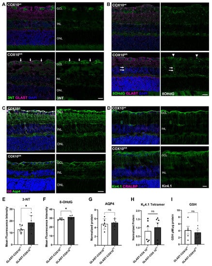 Oxidative stress depends on the balance of antioxidant synthesis and reactive oxygen species generation and can be determined by examining oxidative modifications of protein, DNA, and lipids. Immunolabeling for 3-nitrotyrosine (3NT), a marker for protein nitrosylation, shows greater 3NT label in the IPL of GLAST-COX10fl/fl retina, and a shift of 3NT into the MG end feet of GLAST-COX10fl/fl retina from its primary location in retinal ganglion cells in the wildtype retina (Figure 3A,E). Immunolabeling for 8OHdG, a marker of nucleic acid oxidation, was increased in the ganglion cell layer (GCL), as well as in MG processes of GLAST-COX10fl/fl retinas (arrowheads and arrows, respectively; Figure 3B,F). Water balance in the retina is largely the purview of MG through the activity of their Aquaporin-4 (Aqp4) channels. We examined Aqp4 in the retinal cross sections, finding no gross alterations in the distribution of the protein in the GLAST-COX10fl/fl retina (Figure 3C,G and Figure S5). To understand how loss of MG mitochondrial respiration affected extracellular potassium ion clearance properties of MG, we compared levels of Kir4.1 protein in control and GLAST-COX10fl/fl mice. There was no difference in Kir4.1 protein levels between 3-month-old control and GLAST-COX10fl/fl mice (Figure 3D,H and Figure S6). MG are the main source of glutathione (GSH) in the retina [20]; therefore, we examined GSH synthesis, finding no statistically significant differences in the total retinal glutathione (GSH) concentrations between wildtype and GLAST-COX10fl/fl retinas (Figure 3I).