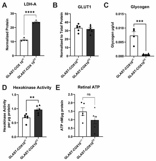 To determine the impact of MG mitochondrial respiration loss on retinal energy metabolism, we assessed the levels and activity of glycolytic enzymes, glycogen, and total ATP. We measured lactate dehydrogenase-a (LDH-A) and glucose transporter-1 (GLUT1) protein using capillary electrophoresis. LDH-A is an isoform of the enzyme prominently expressed in retina [12], and GLUT1 is the glucose transporter found in MG, astrocytes, photoreceptors, and endothelial cells. GLAST-COX10fl/fl mouse retina demonstrated a two-fold increase in LDH-A protein levels (Figure 4A and Figure S7), suggesting there is greater need for conversion of glycolysis-derived pyruvate to lactate (or lactate to pyruvate). We found no significant differences in GLUT1 levels in whole retinal lysates (Figure 4B and Figure S8), indicating no impetus for Cox10 knockout MG to promote GLUT1 upregulation as might be anticipated if needing more glucose for glycolysis. Glycogen concentration from total retinal lysate was significantly decreased in GLAST-COX10fl/fl compared to wildtype controls, indicating usage of glucose as opposed to continued storage (Figure 4C). Hexokinase activity was significantly increased in mutant mice (Figure 4D), suggesting increased glycolysis with the destabilization of OXPHOS in MG. The higher hexokinase activity may account for the diminished glycogen observed. No significant changes were found in the expression of GLAST (Supplementary Data, Figure S3). Total ATP measured in retinal lysate showed no significant difference across the control and GLAST-COX10fl/fl groups (Figure 4E). Collectively, these results demonstrate the promotion of glycolysis in the retina following COX10 knockout in MG.