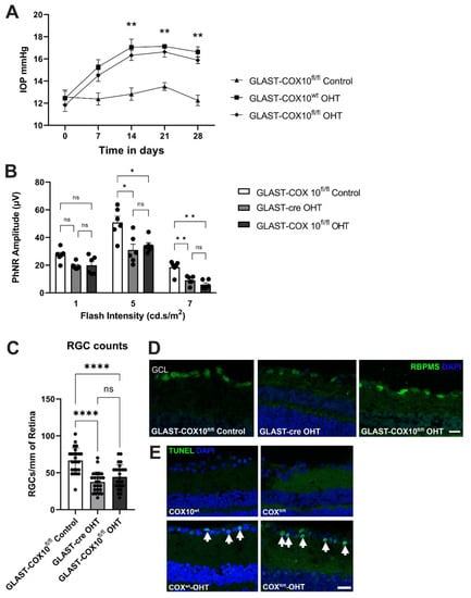 Effect of IOP elevation on photopic negative response in wildtype and GLAST-COX10fl/fl mice. (A) Intraocular pressure was significantly higher in ocular hypertension (OHT) groups (GLAST-COX10wt and GLAST-COX10fl/fl) than in GLAST-COX10fl/fl control from 7d through 28d. Error bars represent mean ± SEM. (B) Photopic negative response (PhNR) mean amplitudes recorded from GLAST-COX10fl/fl mice with and without OHT, plus wildtype (GLAST-cre) mice with OHT under light-adapted conditions showed no differences among groups at 1cd.s/m2. At 5cd.s/m2, both OHT groups had significantly lower PhNR than the knockout without OHT (* p < 0.05). A further reduction of PhNR amplitude was observed at 7cd.s/m2, with both OHT groups having significantly reduced PhNR as compared to the GLAST-COX10fl/fl mice without OHT (** p < 0.01). Values are ± SEM; 6–8 mice per group. * p < 0.05, ** p < 0.01. (C) RGC quantification from retinal cross-sections show significantly higher RGC number in GLAST-COX10fl/fl control retina as compared to both GLAST-cre with OHT (**** p < 0.0001) and GLAST-COX10fl/fl with OHT (**** p < 0.0001). Error bars represent mean ± SEM. (D) Representative immunofluorescence images of retinas from each experimental group that were used for RGC quantification in (C). RBPMS (green) was used as an RGC marker. (E) TUNEL labeling to identify apoptotic cells (white arrows) in retina showed apoptotic cells in the COX10wt and COX10fl/fl groups with OHT only. Scale bars = 25 µm.