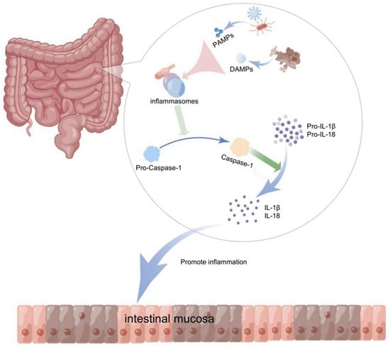The concept of inflammasomes was first proposed by Jurg Tschopp in 2002, and was composed of three main components: (1) pattern-recognition receptors (PRR) or NOD-like receptors (NLR) or AIM2-like receptors (ALR); (2) apoptosis-associated speck-like proteins containing caspase recruitment domains (ASCs); and (3) caspase proteases [5]. The polyprotein complex with those three parts is appproximately 700 kDa [6]. The innate immune system protects the body from pathogenic microorganisms and harmful substances and is involved in maintaining homeostasis in the gastrointestinal tract. As an important receptor and sensor in the innate immune system, the inflammasome plays an important role in inflammatory signaling by recognizing pathogenic factors, such as bacteria, fungi, viruses, and products of cell damage, and by initiating inflammatory responses through pro-inflammatory factors [7]. The production of inflammatory factors and cell death mediated by inflammasome activation is closely related to the body’s defense against pathogenic microbial infection and the maintenance of homeostasis, making this phenomenon an integral part of innate immunity. Something like pathogen-associated molecular patterns (PAMPs) from invading pathogens, such as lipopolysaccharide (LPS), peptidoglycan, muramyl dipeptide (MDP), bacterial RNA, and danger-associated molecular patterns (DAMPs) from damaged and dying cells in the host, triggered PRR [8]. PRR binds to the adapter ASC and effector pro-caspase-1 to complete NLRP3 inflammasome assembly, then promotes pro-caspase-1 self-cleavage to switch on the production of activated caspase-1, which further triggers IL-1-family cytokines, pro-IL-1β and pro-IL-18, into biologically activated inflammatory factors, IL-1β and IL-18, through proteolysis [9]. Therefore, the inflammasome is regarded as a key factor required for the secretion of IL-1β and IL-18, which play a vital role in innate and adaptive immunity and inflammatory responses in the body [10] (Figure 1).