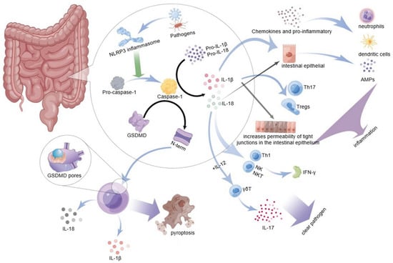 Pyroptosis induced by the activation of immune response after the recognition of risk factors by inflammasomes destroys the cells infected by pathogens; the replication of pathogens in the cells is inhibited in this way to avoid the further spread of pathogens in the intestine [56]. At the same time, IL-1-family cytokines, IL-1β and IL-18, that communicate with other cells will also be released to further activate the inflammatory activity and immune response against related pathogens, thus stimulating the immune system to eliminate pathogenic infection factors and helping maintain the stability of the gastrointestinal tract [57]. Although pyroptosis protects the body from pathogenic infection by antagonizing infection or endogenous dangers, hyperactivation of pyroptosis can lead to fatal sepsis [58]. Loss of GSDMD impairs the body’s ability to clear the intestinal bacterial infection and enteroviral infection. However, the inflammasome has a complex mode of action in the intestine. Its detailed mechanism of action in intestinal immunity still needs more in-depth research.