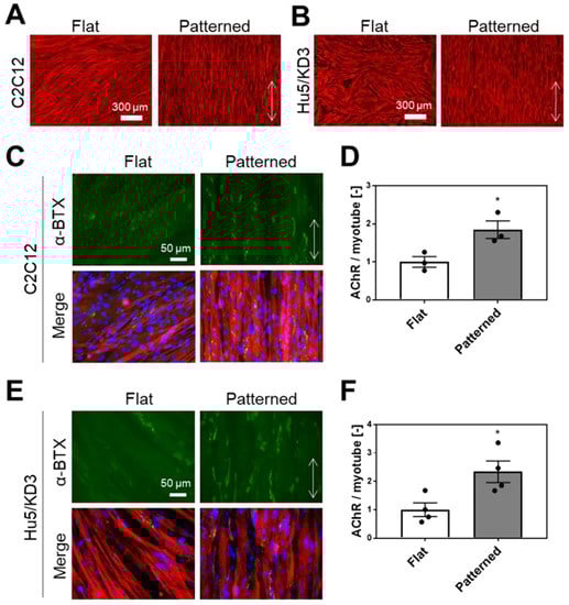 We investigated whether the micropatterned PDMS substrate with linear grooves (Figure S1A) enhanced AChR clustering in myotubes cultured on their surfaces. Mouse C2C12 myoblasts and human Hu5/KD3 myoblasts were used in this study. C2C12 and Hu5/KD3 myoblasts were cultured and differentiated into myotubes on surfaces with grooves. The myotubes were aligned along the direction of the linear grooves (Figure 1A,B). Because the orientation angles of the myotubes were similar for all sizes (5, 10, 15, and 20 µm) of the lines and spaces on the PDMS substrate (Figure S1B,C), we did not segregate the sizes of the pattern and randomly observed myotubes on the substrate in subsequent experiments (Figure S1A).