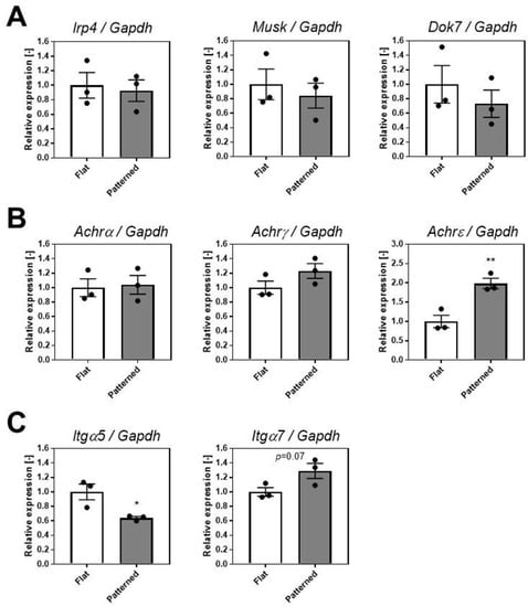 Gene expression analysis of C2C12 cells cultured on the patterned surface. (A) Lrp4, Musk, and Dok7. (B) Achrα, Achrγ, and Achrε. (C) Itgα5 and Itgα7. Data are expressed relative to Gapdh. Data points represent mean ± SD (n = 3). * p < 0.05 versus flat. ** p < 0.01 versus flat.