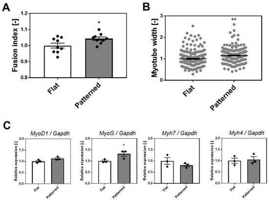 Degree of differentiation of C2C12 cells cultured on the patterned surface. (A) Fusion index. Data points represent mean ± SD, quantified from nine observations. (B) Myotube width. Data points represent mean ± SD, quantified from myotubes (215 for flat and 216 for patterned) in nine observations. (C) Gene expression of representative marker genes for SkM development (MyoD1, MyoG, Myh7, and Myh4). Data points represent mean ± SD (n = 3). * p < 0.05 versus flat. ** p < 0.01 versus flat.
