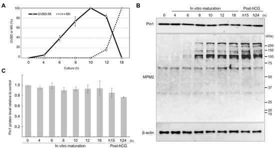 In vitro maturation of oocytes and expression of Pin1 and phosphorylated mitotic proteins detected using anti-MPM2 antibody at different stages of maturation in vitro and in vivo. (A) Maturation rates at different times during in vitro maturation of oocytes. Solid and dashed lines indicate the ratios of oocytes in germinal vesicle breakdown-metaphase I (GVBD-MI) and metaphase II (MII), respectively. Data are expressed as means ± SEM for five independent experiments. (B) Immunoblot analysis using anti-Pin1 and anti-MPM2 antibodies and extracts of oocytes collected at 0, 4, 6, 8, 10, 12, and 18 h after the start of in vitro culture and in vivo-matured oocytes collected from the oviducts of mice at 15 (h15) and 24 h (h24) after human chorionic gonadotropin injection. Extracts of 50 oocytes were applied to each lane. β-actin was used as the loading control. Immunoblot analysis was performed using five sets to confirm reproducibility. (C) Protein levels of Pin1. β-actin was used as a reference for quantification. The values shown are means ± SEM of three biological replicates. The expression level at 0 h is 1; changes in the expression level of Pin1 over time are shown.