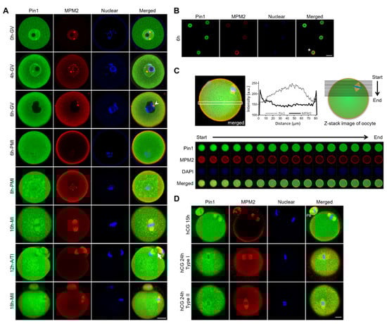 First, to elucidate the involvement of Pin1 in oocyte maturation, its localization across various stages of maturation was determined (Figure 2A–D). To detect the localization of phosphorylation targets of Pin1, changes in the MPM2 antibody staining, as a marker of phosphorylated Ser/Thr-Pro, were examined. Fully grown GV-stage oocytes were collected from the ovarian follicles of 3-week-old wild-type (WT) mice and cultured for 18 h in Waymouth’s medium containing 4 mM hypoxanthine. A representative localization pattern based on immunostaining of more than 100 oocytes, fixed over time, showed the characteristic behavior of Pin1 and phosphorylated mitotic proteins in GV, GVBD (also called pro-metaphase I [PMI]), MI, anaphase/telophase I (A/TI), and MII (Figure 2A). In GV-stage oocytes, Pin1 was detected throughout the cytoplasm but showed particularly strong nuclear localization. The expression of proteins detected using the anti-MPM2 antibody was observed in the nucleus as spots (0 h GV) and was localized in the vicinity of the nuclear membrane, 4 h after the start of culture (4 h GV). In GV-stage oocytes, observed at 6 h (6 h GV) after IVM, Pin1 was localized around the nuclear membrane, and strong MPM2 staining was observed at the nuclear membrane. These results suggest that Pin1 or its related factors are involved in the collapse of the nuclear envelope. As shown in Figure 2A (for 6 h PMI) and Figure 2B, after GVBD, the expression of MPM2 antigens increased dramatically, and they became strongly localized in the cytoplasm (6 h PMI). The changes in the expression of proteins detected using the anti-MPM2 antibody at GV and after GVBD are shown in Figure 2B. The fluorescence signal for MPM2 was stronger in oocytes that had undergone GVBD than in the GV-stage oocytes. In contrast, Pin1 was localized throughout the cytoplasm and was strongly expressed around the chromosomes (8 h PMI). During MI, A/TI, and MII, Pin1 and MPM2 showed similar localization patterns (10 h MI, 12 h A/TI, 18 h MII). Next, we examined the MPM2 localization in metaphase oocytes, using confocal Z-stacks. Based on an optical section showing the spindle position, we found that anti-MPM2-reactive phospho-mitotic proteins were strongly localized in the MI oocyte cortex (Figure 2C). Additionally, Pin1 was expressed throughout the cytoplasm and was enriched at the spindle. Interestingly, Pin1 was localized in the midbody, forming a contractile ring during the later stages of division (Figure 2A, 12 h A/TI). During oocyte maturation in vertebrates, cytokinesis is initiated after one pole of the bipolar MI spindle attaches to the oocyte cortex, resulting in the formation of a polar body and a mature oocyte [,,,]. The essential role of a properly formed direct contractile ring in separating the cytoplasm and polar body during polar body extrusion and the observed Pin1 localization suggest that Pin1 is likely involved in division.