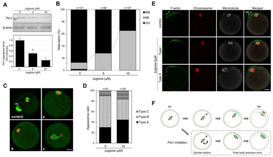 The effects of inhibition of Pin1 activity were assessed using the Pin1-specific inhibitor, juglone (5-hydroxy-1,4-naphthoquinone). The level of Pin1 decreased with the administration of juglone in a concentration-dependent manner; at 10 µM, the expression was approximately one-fourth of that in the control (Figure 3A; 51% and 25% expression at 5 and 10 µM, respectively, compared with that in control). Although higher concentrations of juglone may block Pin1 in oocytes, in previous studies, we observed that treatment of oocytes with 25 µM or higher concentrations of juglone for 18 h resulted in 0% progression to MII (unpublished data). It has been confirmed that the frequency of nuclear condensation also increases. In this study, the effects of 5 and 10 µM juglone were compared, as no cell death occurred at these concentrations. The maturation rates (at the MII stage) after 18 h were 87.2%, 71.9%, and 34.7% in oocytes treated with vehicle control, 5 µM juglone, and 10 µM juglone, respectively, indicating that juglone inhibits the extrusion of the first polar body (Figure 3B). Oocytes in MI showed abnormalities in spindle morphology or chromosome localization. However, chromosome condensation and cell death were not observed (Figure 3C). After 18 h of culture, the oocytes were mature and exhibited an intact spindle and the first polar body, as observed in the control. However, in the treated group, 28.1% and 65.3% of oocytes were arrested at MI, following treatment with 5 and 10 µM juglone, respectively, and showed disrupted spindle fibers, and undefined spindle poles (Figure 3Ca–c). The MI spindles were rotated and positioned parallel to the oocyte cortex (Figure 3Ca). Additionally, the spindle was small, chromosomes were scattered away from the metaphase plate, the polar body was not extruded (Figure 3Cb), and chromosome separation was evident in the cytoplasm (Figure 3Cc). These results suggest that Pin1 is involved in the formation and maintenance of the spindle and extrusion of the first polar body in oocytes. The oocytes were classified into three types, namely, A, B, and C, based on certain features: oocytes in which the MI spindle was rotated by juglone treatment and oocytes in which the spindles were positioned parallel to the cortex were counted as type A; oocytes with weak spindle fibers and unclear spindle poles as type B; and those with abnormal chromosome alignment and distribution as type C. Figure 3D shows the percentage of type A, B, and C oocytes exhibiting irregularities with MI progression and the first polar body extrusion, following juglone treatment. At 5 and 10 µM juglone, 30% and 44% type A, 60% and 39% type B, and 10% and 17% type C oocytes, respectively, were observed. These results establish that Pin1 inhibition affects the spindle structure and intracellular arrangement.