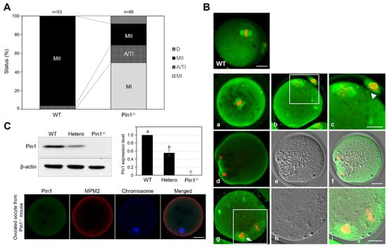 The maturation status of ovulated oocytes was evaluated by assessing α-tubulin localization and the nucleus. Only 23.2% of the ovulated oocytes derived from Pin1−/− mice were morphologically mature (Figure 4). Most oocytes collected from Pin1−/− mice did not exhibit extrusion of the first polar body. On comparing the WT and Pin1−/− mice, the percentages of oocytes in MI were 0% and 50%, in A/TI were 3.8% and 18.6%, in MII were 96.2% and 23.2%, and of those undergoing cell death were 0% and 8.2%, respectively (Figure 4A). In the ovulated oocytes collected from Pin1−/− mice, spindle formation and extrusion of the first polar body were found to be disrupted (Figure 4Ba–i). Typically, we observed incomplete spindle formation (Figure 4Ba), a lack of separation of the cytoplasm and polar body after polar body extrusion (Figure 4Bb,c), and a lack of extrusion of the first polar body outside the cytoplasm (Figure 4Bd–i). Immunoblotting and immunofluorescence staining were used to confirm that these oocytes indeed lacked Pin1 expression (Figure 4C). Taken together, these results show that Pin1 plays an important role in meiosis.