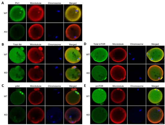 We previously reported that Akt and mTOR are involved in spindle formation and polar body extrusion during meiosis in mice []. From the immunoblot analysis of MPM2 (Figure 2B), it is expected that Pin1 targets multiple proteins. Because Akt (60 kDa) and mTOR (289 kDa) are candidate proteins based on their molecular weights, the localization of these proteins was analyzed in oocytes derived from Pin1−/− mice. Because Pin1 has been shown to be involved in regulating the phosphorylation of Ser/Thr kinase [], the localization of total protein as well as of phosphorylated proteins was observed and compared. As Akt and mTOR are localized on the mitotic spindle, their signals were compared by co-staining with α-tubulin. The results showed that localization on the spindle was very weak (Figure 5A–E). Although the signals of both proteins were not completely abolished, the results indicate that Pin1 affected the localization of Akt and mTOR.